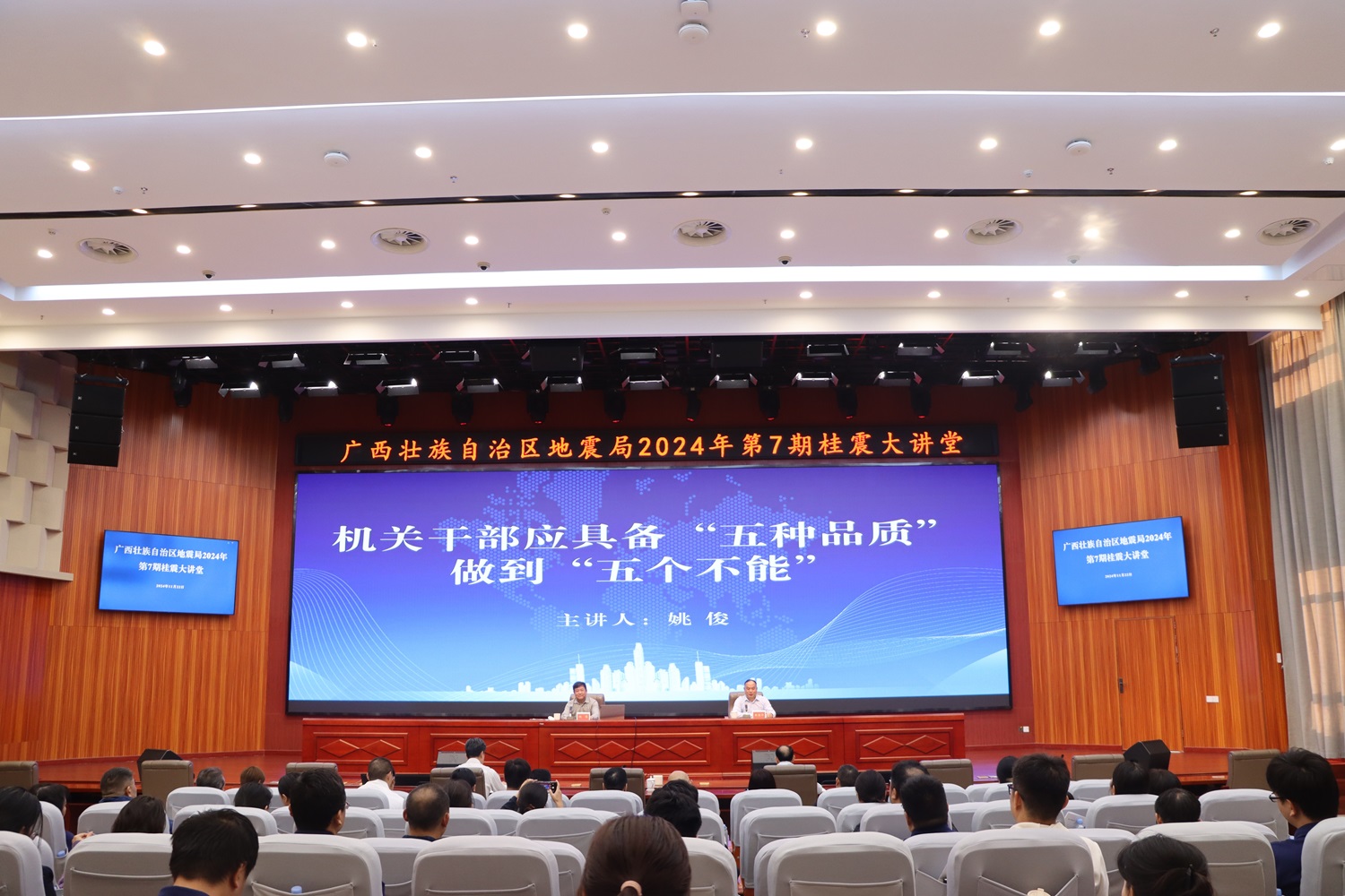 在参观活动前,广西壮族自治区地震局开展2024年第7期桂震大讲堂,顾问姚俊以“机关干部应具备‘五种品质”做到“五个不能’”为题,跟自治区地震局干部职工讲进行了探讨交流,从“一要严谨细致、一丝不苟,二要忍辱负重、淡定从容,三要踏实肯干、吃亏是福,四要站立高远、勤于思考,五要谦虚低调、团结同志”五种品质,详细讲述机关工作人员如何办文办事;从“不能忘事、不能怕事、不能误事、不能多事、不能乱事”五个不能,萃深入浅出地讲述了如何提高工作质量效率。最后,深有激情地鼓励道:机关工作不仅仅是完成任务那么简单,而是一个锻炼个人能力、提升综合素质的平台,只有不断学习、不断实践,才能在这个平台上走得更远、更稳。只要我们心中有目标、脚下有行动、手中有本领,就一定能够创造出更加辉煌的业绩和更加美好的未来!